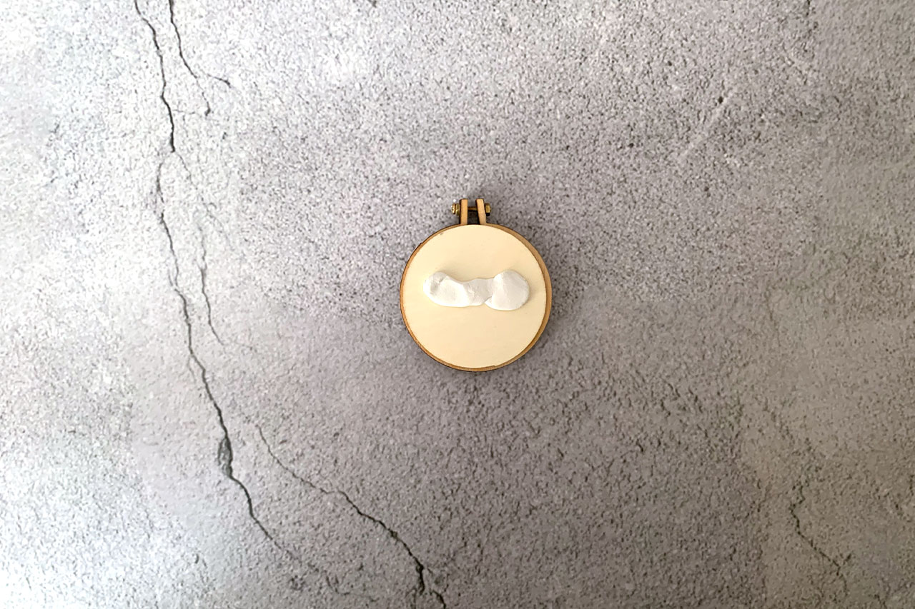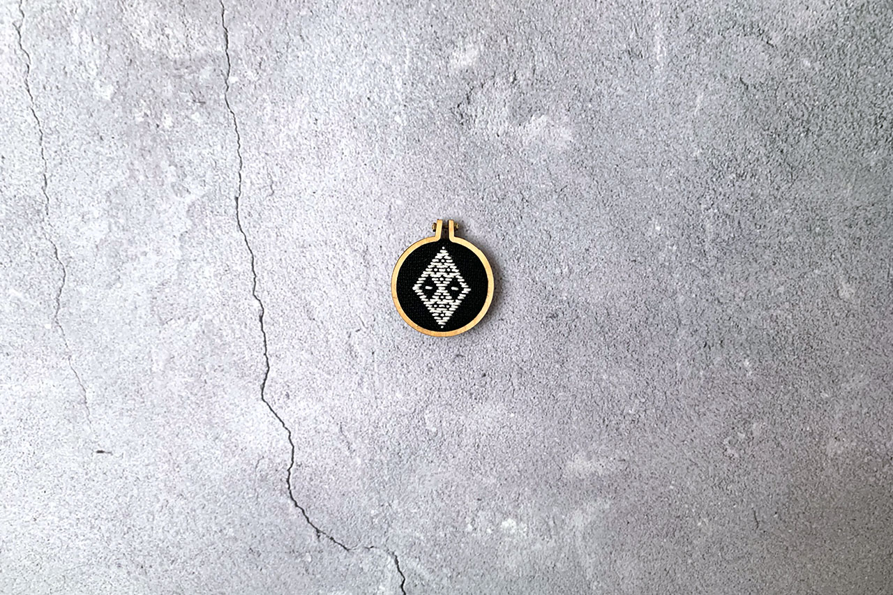 こぎん刺しの始まりが衣服であったことから、身に付けるものを作る事が多いのですが、生まれ育った家には、こぎん刺しのタペストリーやテーブルセンター、衝立など、“飾る”ものが多かったなという事を思い出し、「かわいい!」と思って購入したままの小さな刺繍枠に、こぎん刺しをはめて壁に飾りました。